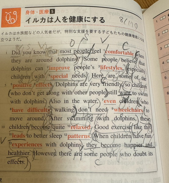 このように、1つの文をスラッシュで区切り、S,V,Oなどというように当てはめていきました。これを娘が事前に取り組み、それをチェックして間違えていたところやあいまいなところは再度「英文読解」に戻って読み直しました。