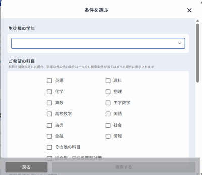 複数の条件を指定してさらに細かく先生を探すことができます。